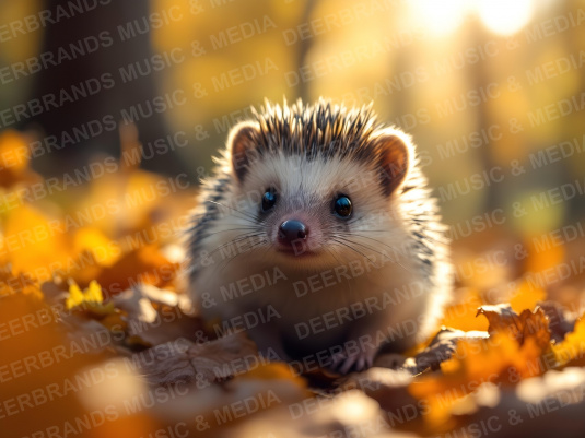 Dieses zauberhafte Tierfoto zeigt einen kleinen Igel, der aufmerksam zwischen herabgefallenen Blättern sitzt. Die goldene Herbstsonne durchflutet den Hintergrund, während das Tier mit seinen funkelnden Äuglein direkt in die Kamera blickt. Die sanften Farben des Waldbodens, das weiche Fell und die spitzen Stacheln erzeugen eine perfekte Balance zwischen Natürlichkeit und Ästhetik. Ideal für Kalender, Naturmotive, Kinderzimmer oder emotionale Herbstkampagnen.